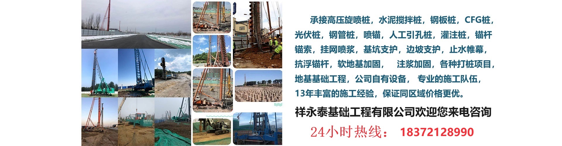 祥永泰基礎工程有限公司是一家專業從事公路路基、路面、管道及橋頭等軟地基加固的公司;我公司主營高壓旋噴樁施工,水泥攪拌樁施工,三軸攪拌樁施工,注漿加固,錨桿錨索施工,鋼板樁施工,鋼管樁施工,光伏樁施工,CFG樁施工,基坑支護,鉆孔灌注樁,加勁樁,樁基施工,擁有一批經驗豐富的技術、施工人員和專業的成套壓漿設備。公司有專業施工技術人員10余人、施工人員70余人、壓漿成套設備30余套、施工車輛20余臺,施工人員全部經過專業的現場培訓,多人具有數十年的鉆孔、壓漿施工經驗;所有機械設備、車輛安排專人定期保養;保障了壓漿施工的安全、質量及進度。 公司以完善到位的專業化施工技術贏得了省內外項目業主的信賴和好評,公司在堅持技術創新的基礎上,狠抓質量管理,不斷提高服務水平,實現了公司業務的良性發展。